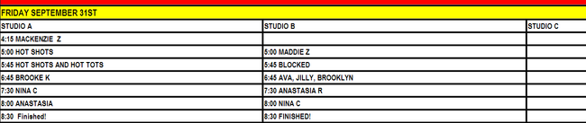 - Thursday - Dances are actually learned. Solos are typically taught in two "private" sessions (one of which may be filmed), each lasting an hour or less. The short amount of time is the principle reason Maddie does not perform tap on the show, as those routines take more time to learn. Group dances are taught in about two hours. Although the girls attend normal schools before going to the studio, they also do additional work with a tutor when the instructors are busy teaching solos to other members.[6]